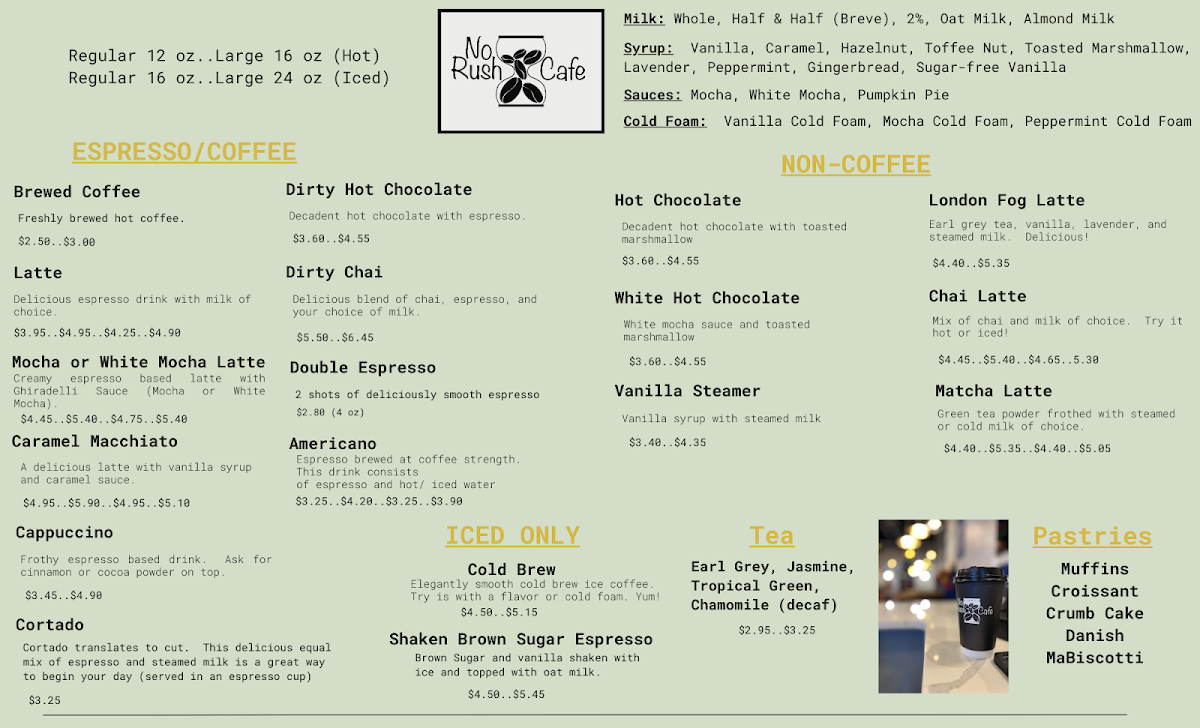 Welcome to No Rush Cafe, a cozy haven nestled at 399 S Main St, Freeport, NY. This charming spot delights with a diverse menu, perfect for your leisurely coffee breaks. Experience a symphony of flavors with their signature Butterscotch Frappe and Caramel Frappe, both indulgent treats crowned with creamy whipped cream and luscious caramel drizzle, each for just $5.55.
